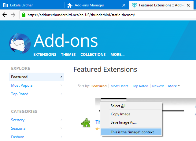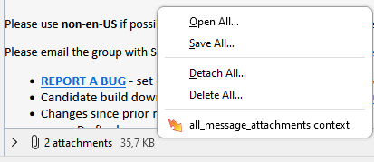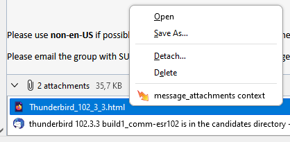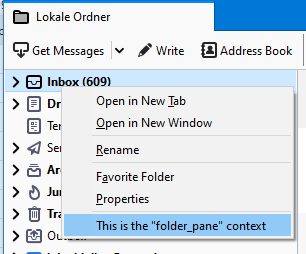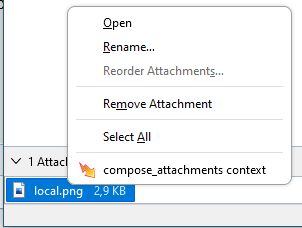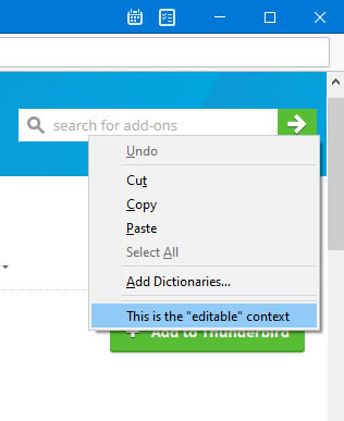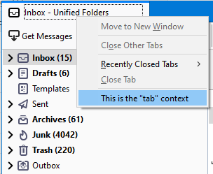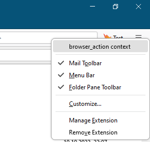 <table><thead><tr><th width="372.3333333333333">Context</th><th width="369">Description</th></tr></thead><tbody><tr><td><code>all</code></td><td>Add menu entries to all supported contexts, excluding <code>tab</code> and <code>tools_menu</code>.</td></tr><tr><td><code>all_message_attachments</code></td><td>Add entries to the context menu of the summary area of message attachments.<br><br><img src="https://1163303201-files.gitbook.io/~/files/v0/b/gitbook-x-prod.appspot.com/o/spaces%2F-L_nKoWlOPz_rkC_kHdV%2Fuploads%2Fgit-blob-445d7d68f7ff25142c3f5ed68720c8d37f7ecc1e%2Fall_message_attachments.png?alt=media" alt=""><br><br>If the message has only one attachment, then the <code>message_attachments</code> context is used instead.</td></tr><tr><td><code>action</code>,<br><code>browser_action</code>, <code>compose_action</code> , <code>message_display_action</code><br><br>N<strong>ote</strong>: <code>browser_action</code> is available in Manifest V2 and <code>action</code> is available in<br>Manifest V3.</td><td>Add entries to the context menu of action buttons.<br><br><img src="https://1163303201-files.gitbook.io/~/files/v0/b/gitbook-x-prod.appspot.com/o/spaces%2F-L_nKoWlOPz_rkC_kHdV%2Fuploads%2Fgit-blob-766cc11b2550030c0fc4b6095fad6941f2d4df31%2Fbrowser_action_context.png?alt=media" alt=""></td></tr><tr><td><code>action_menu</code>,<br><code>browser_action_menu</code>, <code>compose_action_menu</code>, <code>message_display_action_menu</code>,<br><br><strong>Note</strong>: <code>browser_action_menu</code> is available in Manifest V2 and <code>action_menu</code> is available in Manifest V3.</td><td><p>Add entries to the drop-down menu of <a href="https://github.com/thunderbird/webext-examples/tree/master/manifest_v2/menuActionButton">menu typed action buttons</a>.</p><p><img src="https://1163303201-files.gitbook.io/~/files/v0/b/gitbook-x-prod.appspot.com/o/spaces%2F-L_nKoWlOPz_rkC_kHdV%2Fuploads%2Fgit-blob-cb74b70fc692ed95ff3c3bd7275eafaf28940e6a%2Fimage.png?alt=media" alt=""></p></td></tr><tr><td><code>compose_attachments</code></td><td>Add entries to the context menu of attachments in the compose window.<br><br><img src="https://1163303201-files.gitbook.io/~/files/v0/b/gitbook-x-prod.appspot.com/o/spaces%2F-L_nKoWlOPz_rkC_kHdV%2Fuploads%2Fgit-blob-9ca575ab669f1b686834c89cdb69476bd675177f%2Fcompose_attachments_context.png?alt=media" alt=""></td></tr><tr><td><code>editable</code>,<br><code>password</code></td><td><p>Add entries to the context menu of text/password input fields in WebExtension windows, web tabs or message display tabs.<br></p><p>Limited to content areas.<br><br><img src="https://1163303201-files.gitbook.io/~/files/v0/b/gitbook-x-prod.appspot.com/o/spaces%2F-L_nKoWlOPz_rkC_kHdV%2Fuploads%2Fgit-blob-75ffd68ed2deda301f6dc767affdd3b80c596f40%2Feditable.png?alt=media" alt="" data-size="original"></p></td></tr><tr><td><code>folder_pane</code></td><td>Add entries to the context menu of the folder pane of mail tabs.<br><br><img src="https://1163303201-files.gitbook.io/~/files/v0/b/gitbook-x-prod.appspot.com/o/spaces%2F-L_nKoWlOPz_rkC_kHdV%2Fuploads%2Fgit-blob-e3c18fcb99c779deae077c2d0b84466d678a7964%2Ffolder_pane.PNG?alt=media" alt="" data-size="original"></td></tr><tr><td><code>image</code>,<br><code>audio</code>,<br><code>video</code></td><td>Add entries to the context menu of embedded images, audio or video players in WebExtension windows, web tabs or message display tabs.<br><br>Limited to content areas.<br><br><img src="https://1163303201-files.gitbook.io/~/files/v0/b/gitbook-x-prod.appspot.com/o/spaces%2F-L_nKoWlOPz_rkC_kHdV%2Fuploads%2Fgit-blob-728e5f77d73f15bf6e01cfa1ef21f1d446848ffb%2Fimage.png?alt=media" alt="" data-size="original"></td></tr><tr><td><code>link</code></td><td><p>Add entries to the context menu of links in WebExtension windows, in web tabs or in message display tabs.</p><p><br>Limited to content areas.<br><br><img src="https://1163303201-files.gitbook.io/~/files/v0/b/gitbook-x-prod.appspot.com/o/spaces%2F-L_nKoWlOPz_rkC_kHdV%2Fuploads%2Fgit-blob-5f1b405cbbe14b7e9c516e62ad05cd6927a5d574%2Flink.PNG?alt=media" alt="" data-size="original"></p></td></tr><tr><td><code>message_attachments</code></td><td>Add entries to the context menu of attachments of messages.<br><br><img src="https://1163303201-files.gitbook.io/~/files/v0/b/gitbook-x-prod.appspot.com/o/spaces%2F-L_nKoWlOPz_rkC_kHdV%2Fuploads%2Fgit-blob-d5f41f6c3e6fdb11ac197fd4e1e9445c66675b81%2Fmessage_attachments_context.png?alt=media" alt=""></td></tr><tr><td><code>message_list</code></td><td>Add entries to the context menu of the message list area of a mail tab.<br><br><img src="https://1163303201-files.gitbook.io/~/files/v0/b/gitbook-x-prod.appspot.com/o/spaces%2F-L_nKoWlOPz_rkC_kHdV%2Fuploads%2Fgit-blob-cf62de27f221cf0a19b64ef289b2350c4c1bd1c8%2Fmessage_list.PNG?alt=media" alt="" data-size="original"></td></tr><tr><td><code>page</code>,<br><code>frame</code></td><td><p>Add entries to the context menu of WebExtension windows, web tabs or message display tabs, if none of the other content contexts apply (link, selection, image, audio, video, editable, password).</p><p><br>If the page is loaded inside a frame, the <code>frame</code> context applies, otherwise the <code>page</code> context.<br><br>Limited to content areas.<br><br><img src="https://1163303201-files.gitbook.io/~/files/v0/b/gitbook-x-prod.appspot.com/o/spaces%2F-L_nKoWlOPz_rkC_kHdV%2Fuploads%2Fgit-blob-a66a42df62a35438519439bca72e04d5df623f8c%2Fpage.PNG?alt=media" alt="" data-size="original"></p></td></tr><tr><td><code>selection</code></td><td><p>Add entries to the context menu in WebExtension windows, web tabs or message display tabs, if any text has been selected.<br></p><p>Limited to content areas.<br><br><img src="https://1163303201-files.gitbook.io/~/files/v0/b/gitbook-x-prod.appspot.com/o/spaces%2F-L_nKoWlOPz_rkC_kHdV%2Fuploads%2Fgit-blob-5510eeb94e8346cd0ac775453bdac9fbbd2be13e%2Fselection.PNG?alt=media" alt="" data-size="original"></p></td></tr